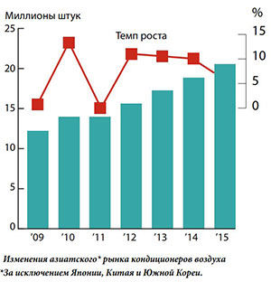 В странах Юго-Восточной Азии растущий средний класс стал одним из факторов, приведших к увеличению объема продаж на 10,5%. В 2015 году объем регионального рынка кондиционеров составил 8,9 млн штук. При этом наиболее впечатляющий рост продемонстрировал Вьетнам, где продажи по сравнению с 2014 годом выросли на 39,3% — до 1,7 млн единиц оборудования. Вьетнам стал одним из крупнейших рынков региона, уже обогнав Таиланд и вплотную приблизившись к Индонезии. Активизация спроса в странах Юго-Восточной Азии, совокупная численность населения которых превышает 600 млн человек, подстегивает мировое производство кондиционеров, создавая почву для оптимистичных прогнозов, касающихся перспектив климатической индустрии.
